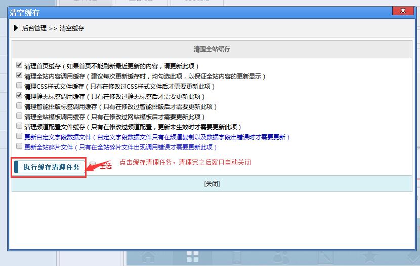 当在后台修改了模版、标签。碎片文件、联系方式等内容,此时右上角不会有自动或手动处理的提示,这时需要点击清空缓存操作,勾选所有选项(如果修改了碎片文件,需要把碎片文件也勾选上),然后执行缓存清理操作,清理完之后窗口自动关闭。