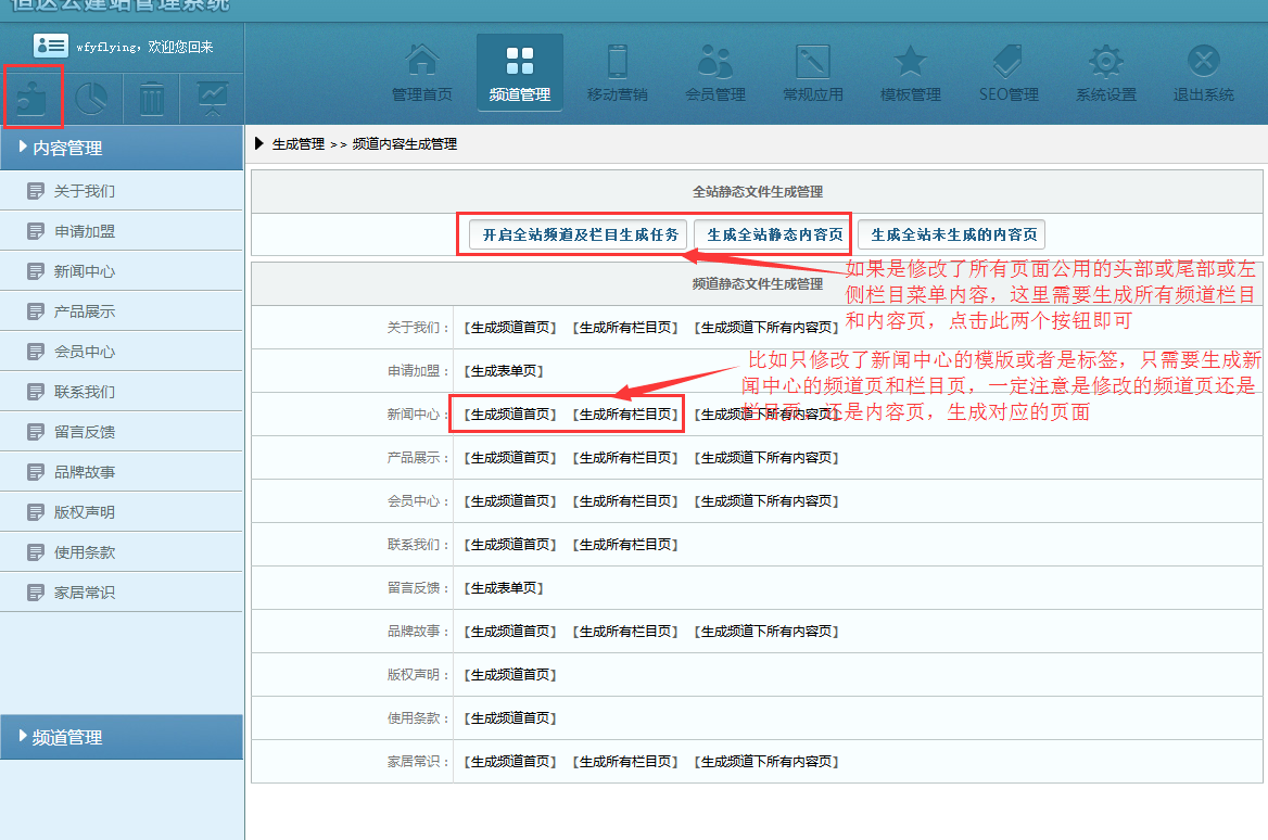 然后需要点击左上角的第一个按钮生成静态页,生成修改的对应页面,如果修改的比较多或者是修改的是头部或底部每个页面都公用部分的内容,点击生成所有页面就可以了。