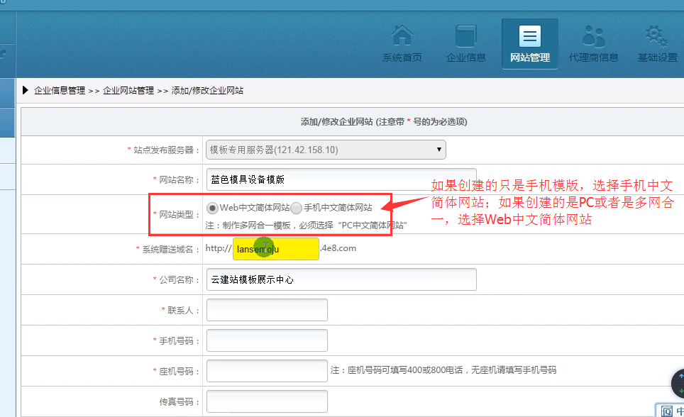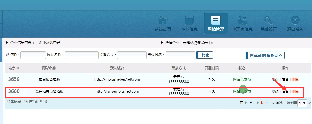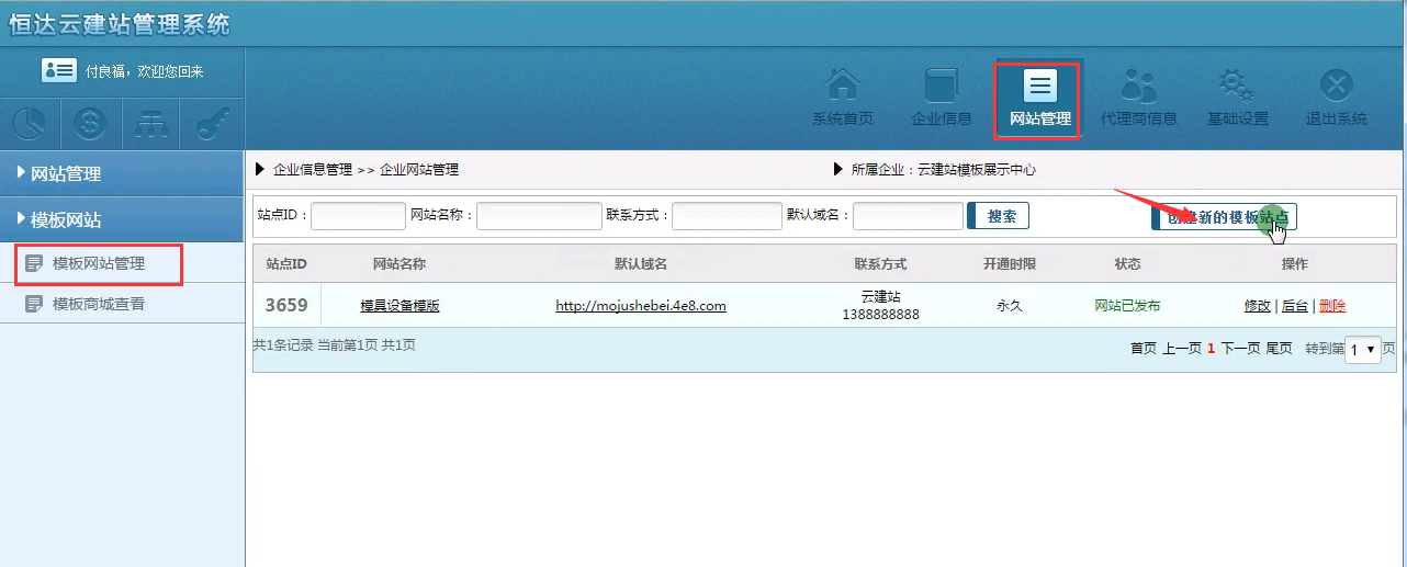 1.首先我们要在我们的后台中的右上角创建新的模板站点,【网站管理】——【模版网站】——【模版网站管理】——【创建新的模版站点】