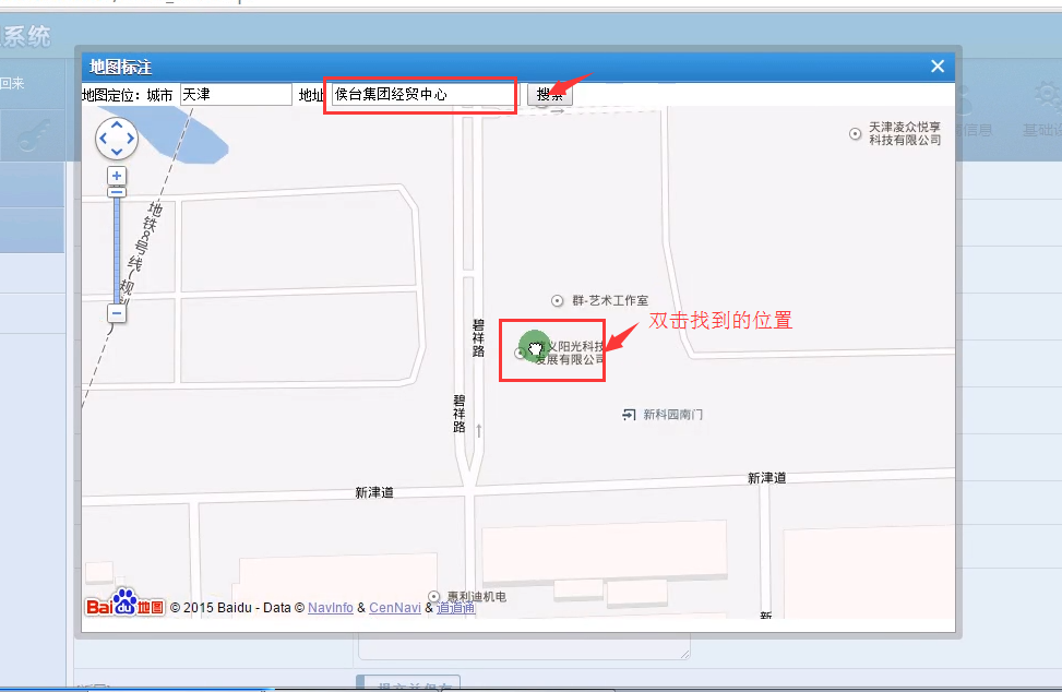 点击【地图标注】,填入要查找的地址,点击【搜索】,然后在地图上找到要查找的位置之后,双击返回即可。