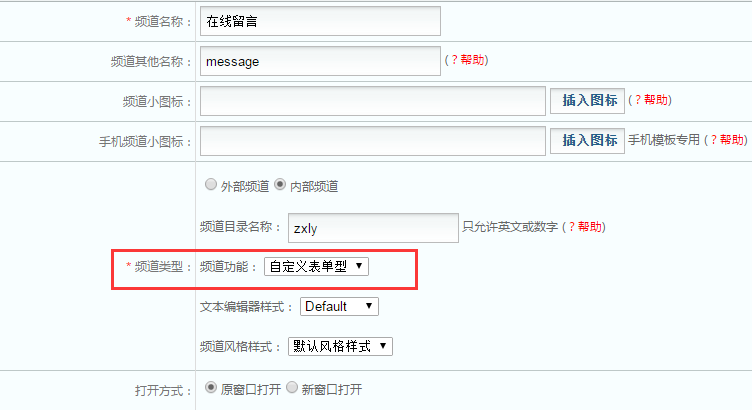 自定义表单型频道主要用于留言,反馈这些收集信息的表单功能,还可以延伸为报名,订单,咨询各类其它表单类型,灵活运用,可以为网站提供更多交互功能频道。自定义表单频道添加如下图所示: