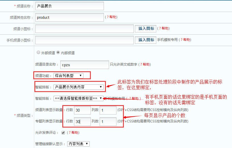这些参数中,有些从字面上就可以明白是什么意思,就不多做解释,有些如“管理链接动默认显示”是用来判断进入频道管理时,只直接列出的频道下的栏目列表,还是列出频道栏目所有添加的内容列表的。“是否参与全站内容调用”,“是否首推荐调用”可用于来“频道/栏目调用”标签配合用来做前台调用的。