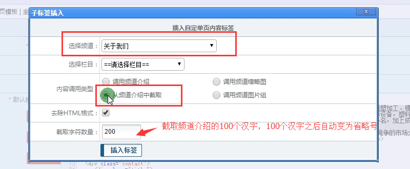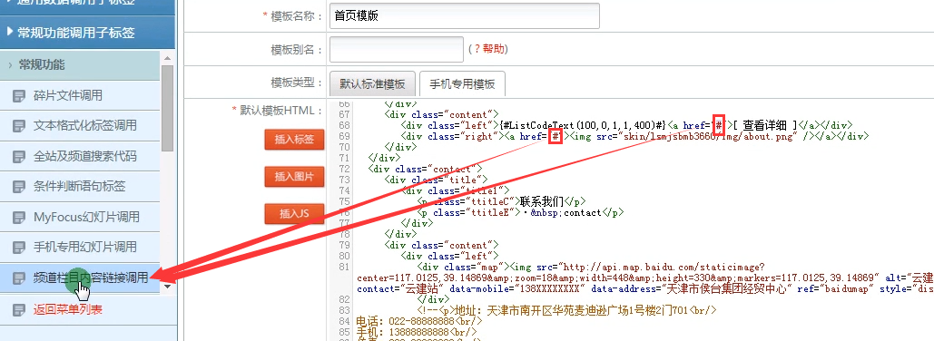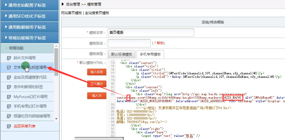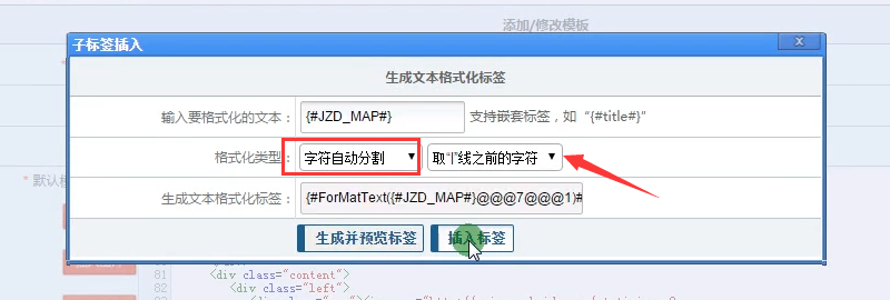 而我们需要的竖线之前的参数,所以还需要继续回到后台,首页模版,选中地图参数标签,剪切下来,插入标签——常规功能调用子标签——文本格式化标签调用