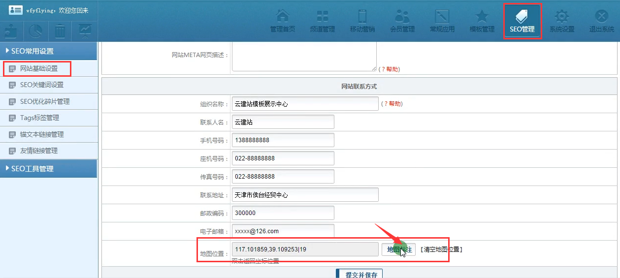 以后如果要修改此处的地图位置,在SEO优化中修改了地图位置,这里就相应着跟着变化了