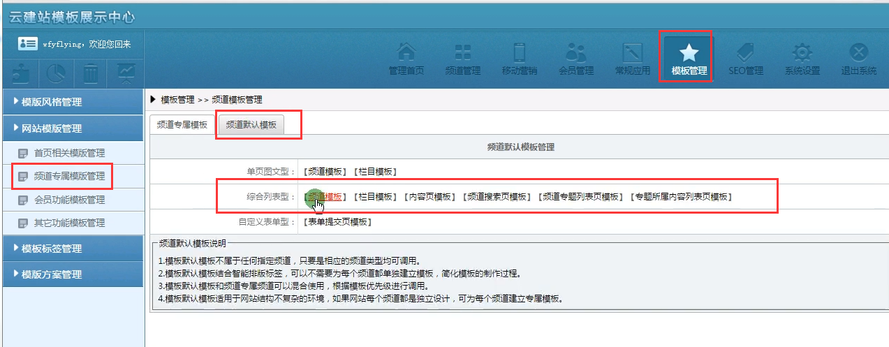 还是在频道默认模版中,找到综合列表型,首先添加频道模版,