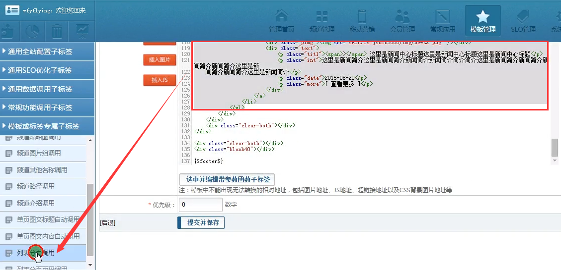 找到综合列表型的,以企业动态为例的静态页,与单页图文型模版一样,用静态标签替换共用部分,头部、尾部、左侧分别替换,面包屑导航和频道名称用标签替换,我们在第二阶段标签处理阶段中,新建了列表翻页排版标签,并且在第三阶段频道建立阶段已绑定相应的标签,所以在综合列表频道页模版中,把<ul></ul>部分选中,然后插入标签——模版或标签专属子标签——列表分页调用