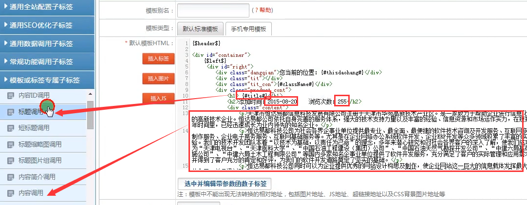 综合列表频道和栏目模版都做完之后,然后就开始做综合列表的内容页,同样还是把静态文件粘贴到内容页模版中,然后用静态标签替换共用部分,头部标签、尾部标签、左侧标签,面包屑导航和频道名称用模版或标签专用子标签替换