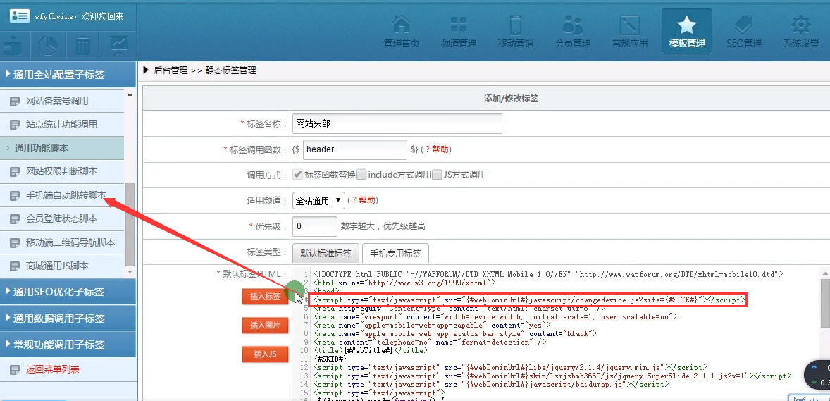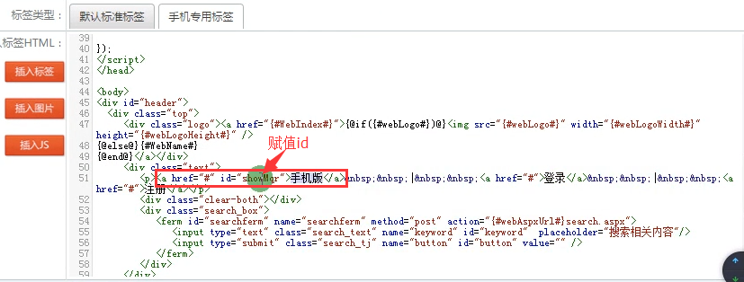 1. 首先回到头部标签,如果我们做的是全网套餐模版,这里需要加上手机端自动跳转脚本,加上此段脚本之后,当在手机上输入相同的网址时,自动跳转到手机端的网站。