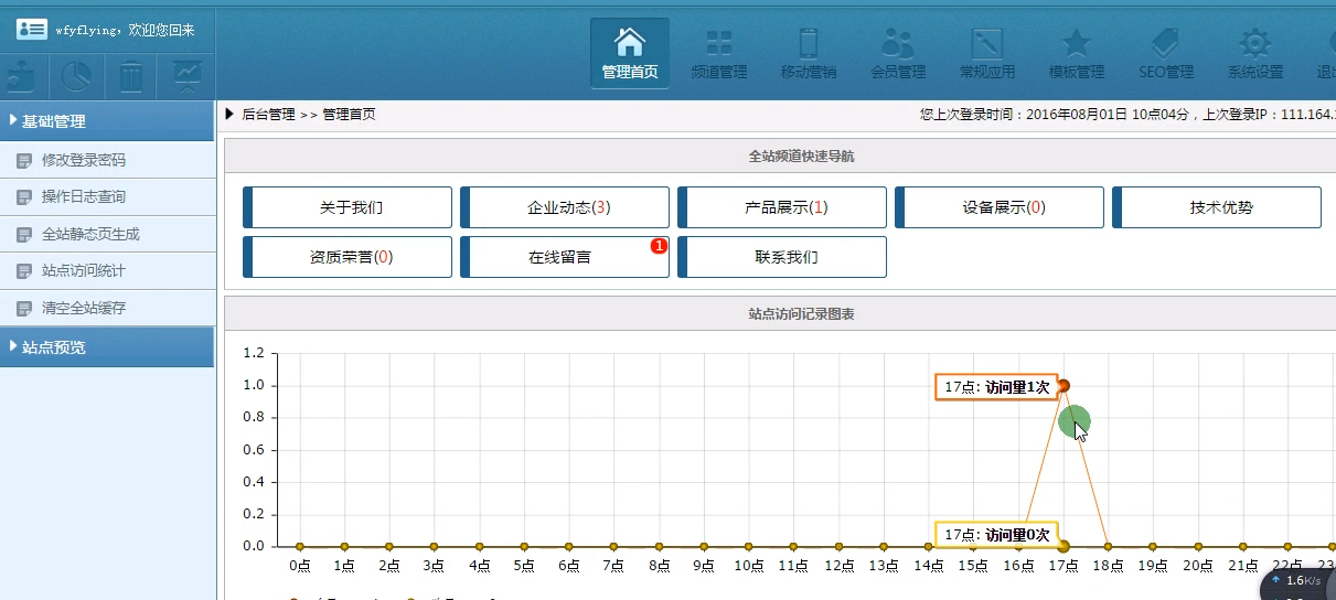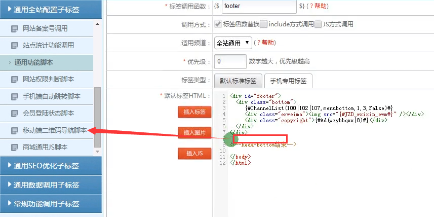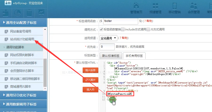 3. 然后还需要在底部标签加上站点统计功能,加上此代码可以统计每个时段网站的访问量