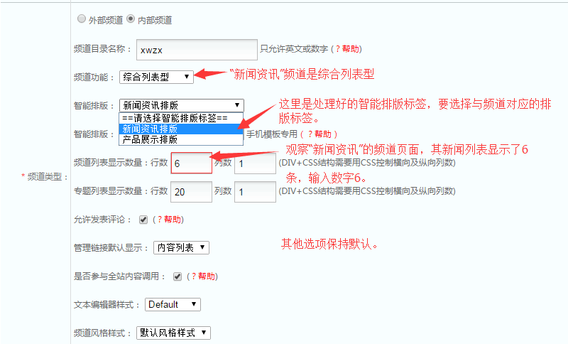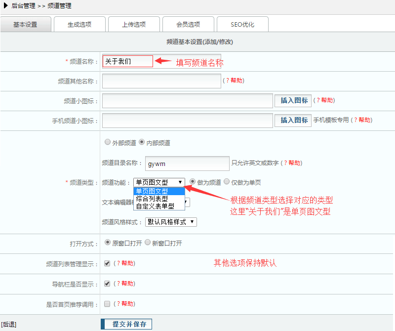“关于我们频道”就建好了。接着建立“新闻资讯频道”,如图,只有“频道类型”这一项做了修改,其他同“关于我们”制作方式一样: