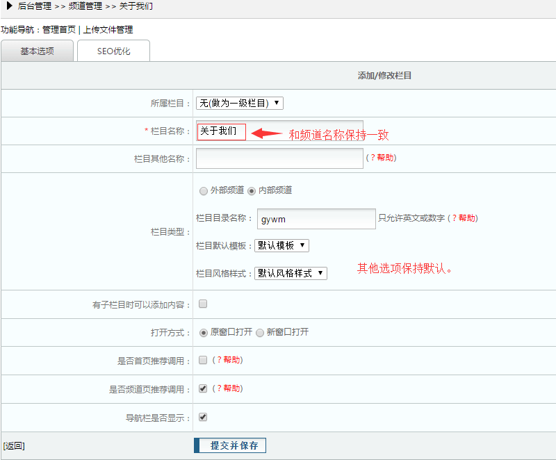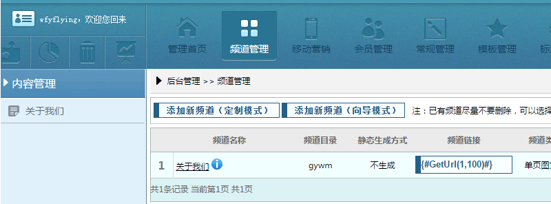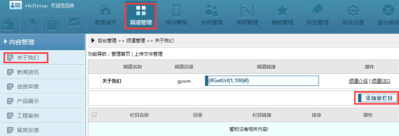 如图,依次点击按钮【频道管理】-【关于我们】-【添加新栏目】: