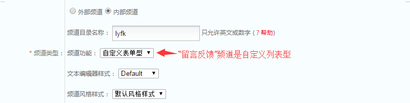 接着是频道“留言反馈”的建立,如图,只将“频道类型”改为自定义表单型即可: