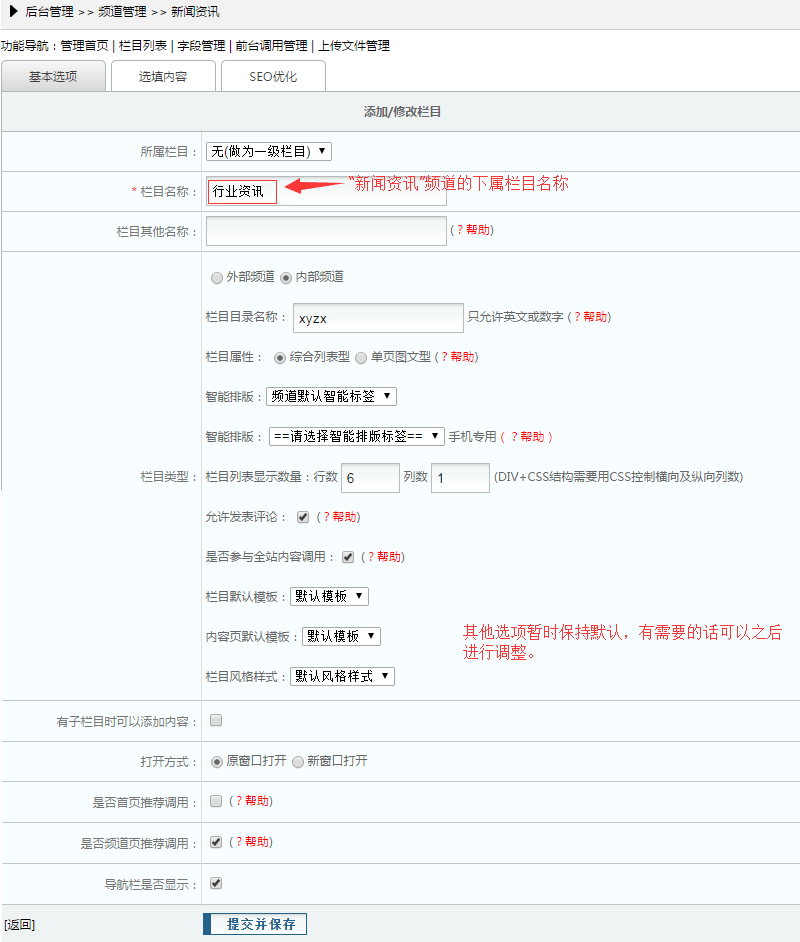 建立“新闻资讯”频道的栏目时,依次点击【频道管理】-【新闻资讯】-【添加新栏目】,出现如下界面: