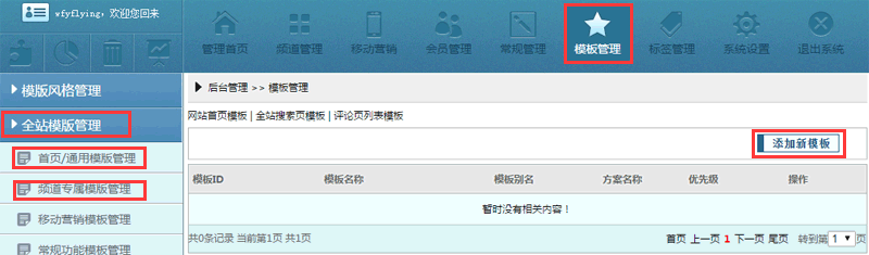 依次点击按钮【模板管理】-【全站模板管理】,可以看到【全站模板管理】下有四个分类,通常我们只会用到其中的【首页/通用模板管理】和【频道专属模板管理】。