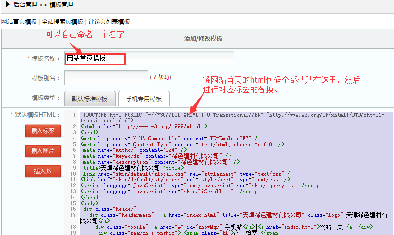 一、首先制作网站首页的模板,点击【首页/通用模板管理】-【添加新模板】,看到如下界面: