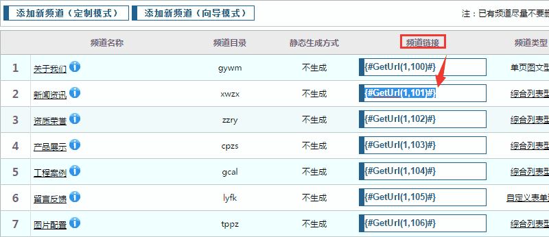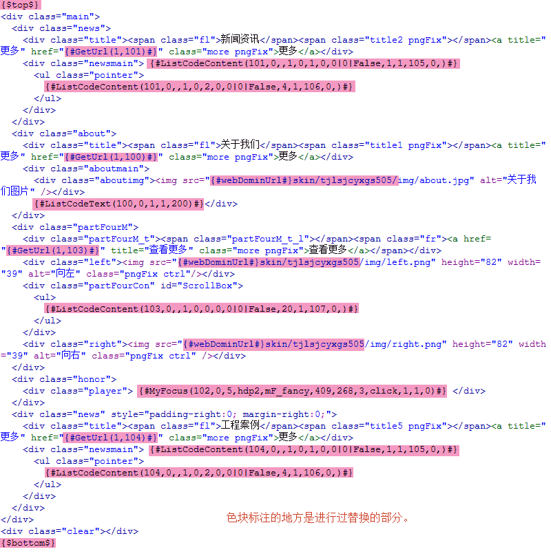 找到每个频道对应的【频道链接】地址,进行复制后,分别粘贴到【首页模板】中黄色标注的部分。完成后,我们看到【首页模板】中最终的显示为: