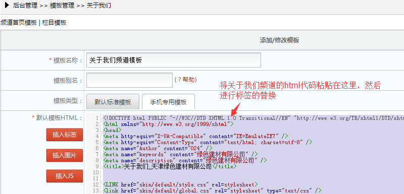 “关于我们”的栏目模板制作,同频道模板制作一样,只需要把上图中【频道名称调用】子标签,替换为【栏目名称调用】子标签即可。