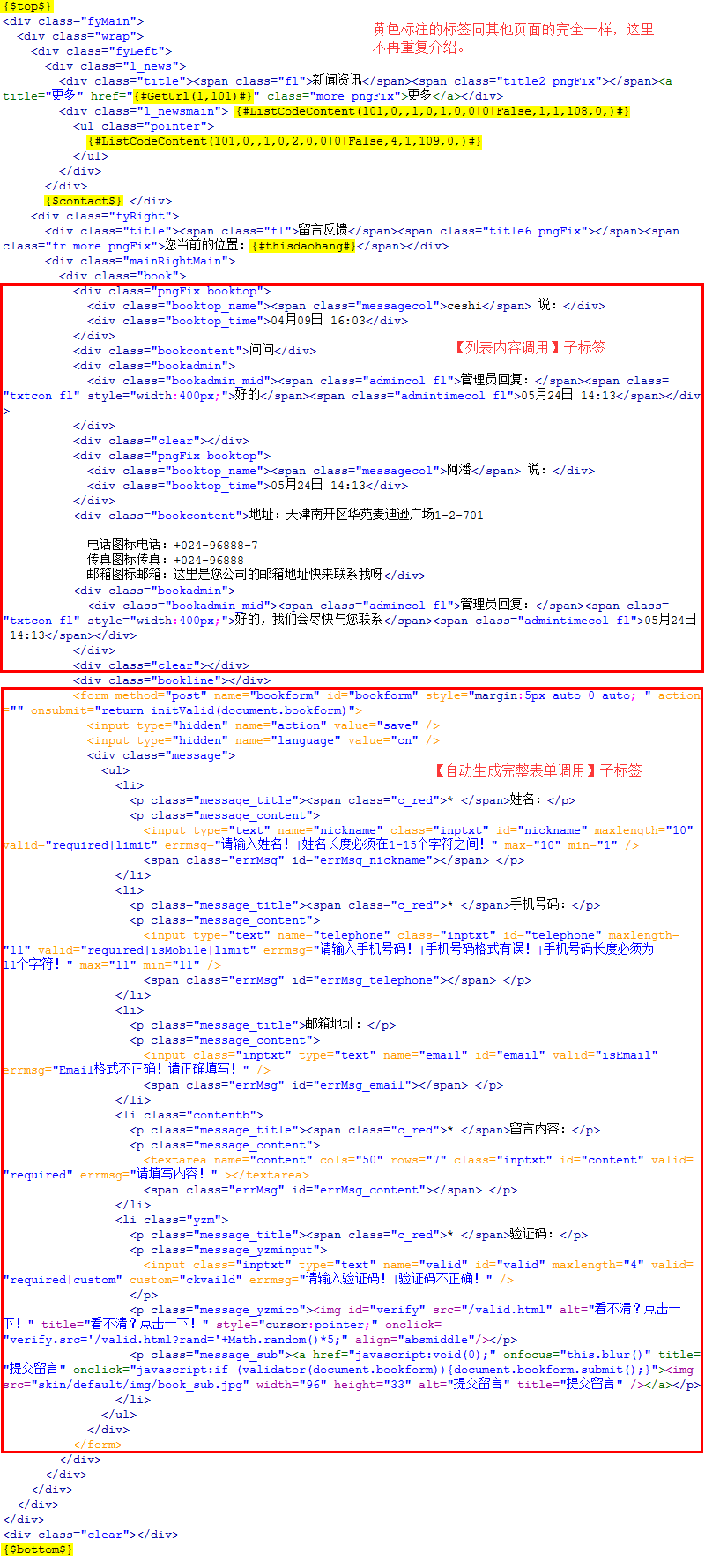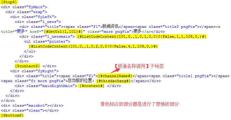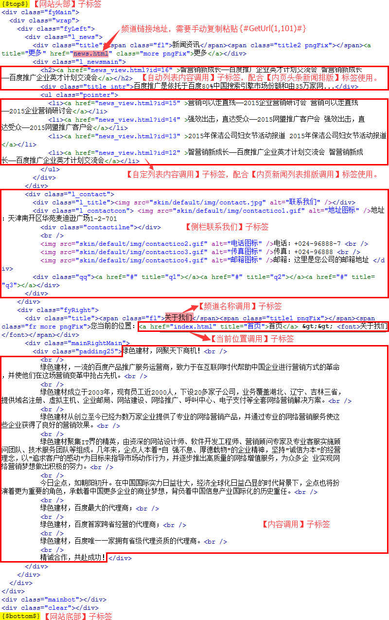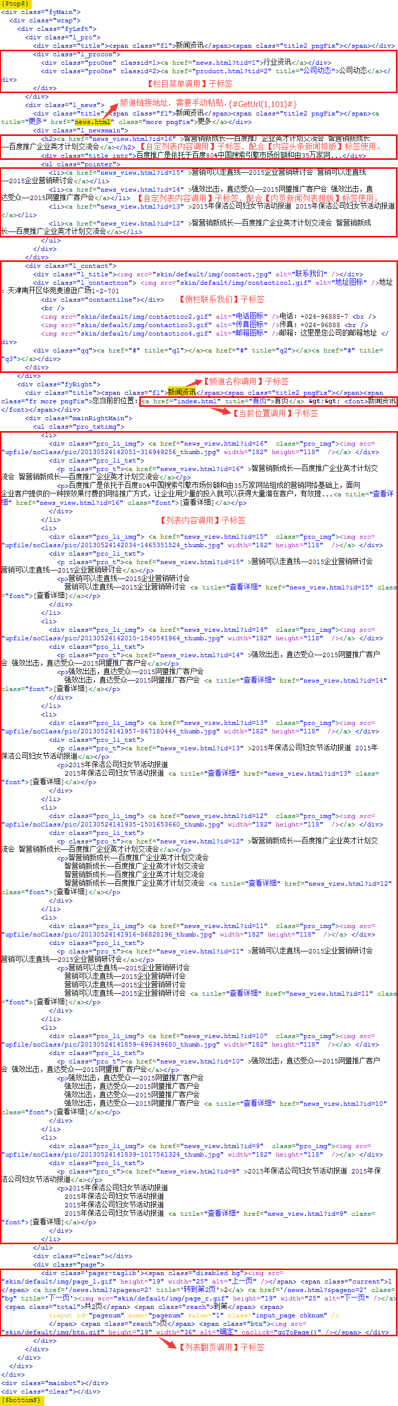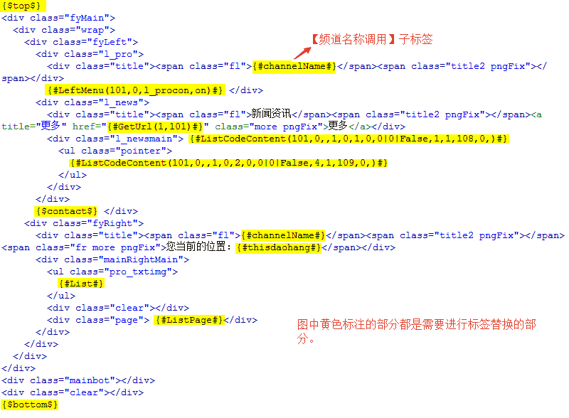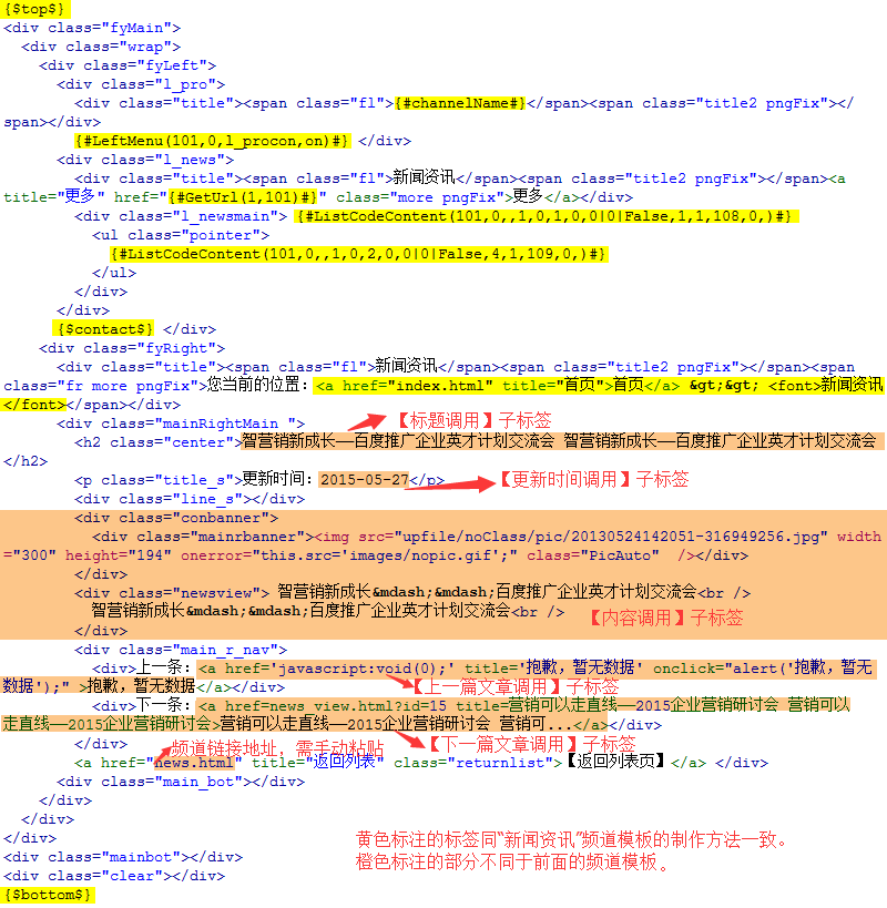 将其html代码粘贴到“新闻资讯”频道模板中,然后进行标签的替换,下图中具体需要替换的部分都做了标注: