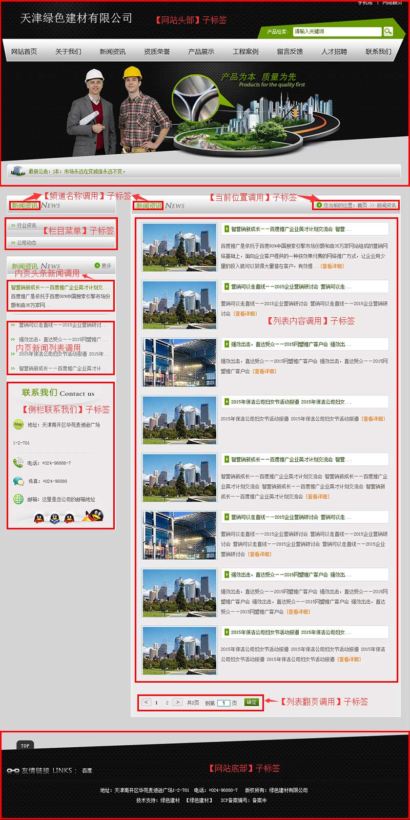 根据图中文字提示,完成标签的替换,“新闻资讯”的频道模板就制作好了,最终结果如下: