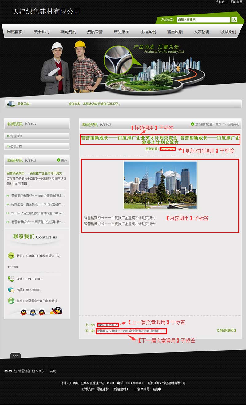 制作栏目模板时,只需将【频道名称调用】子标签改为【栏目名称调用】子标签即可,最后是“新闻资讯”的内容页模板的制作,分析页面: