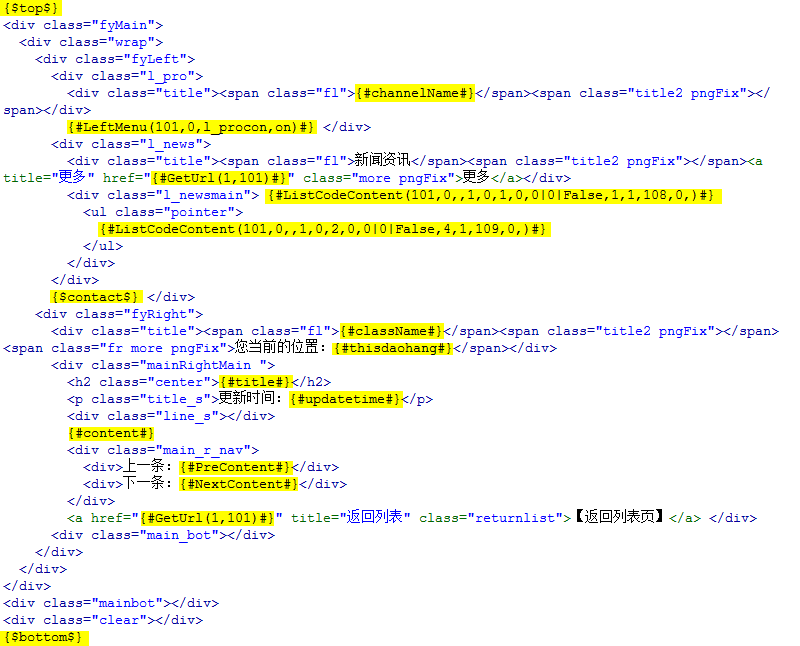 分析得出,页面中标注的部分不同于前面“频道模板”和“栏目模板”,其他地方制作方法一致。html代码中,具体需要替换的部分,下图中做了详细标注: