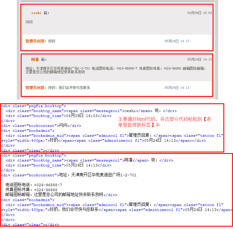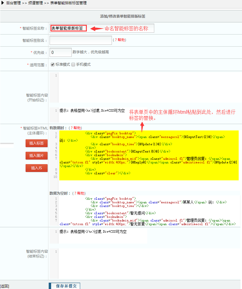 【表单智能排版标签】制作好之后,我们就开始添加“表单提交页模板”,同上,将模板html代码粘贴到模板中后,开始进行标签的替换: