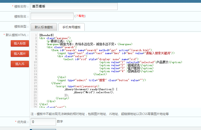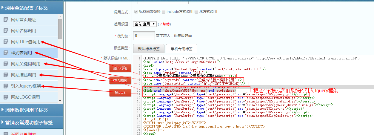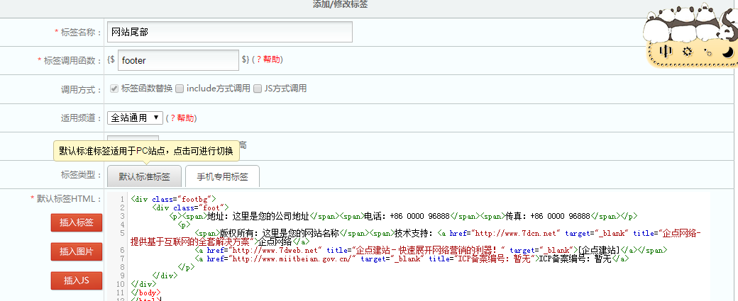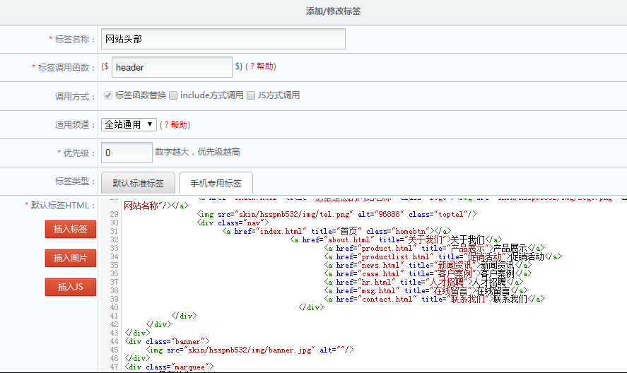 在后台中标签管理——新增静态标签,把刚才头部公用的代码拷进去,标签名称和标签调用函数我习惯用网站头部和header