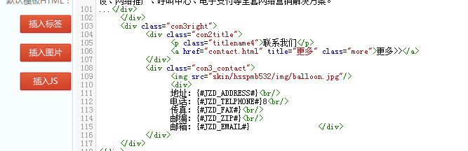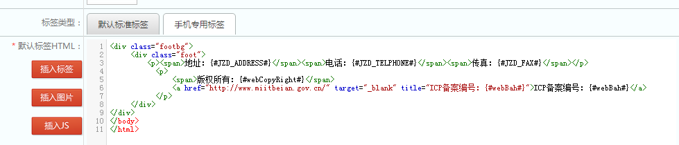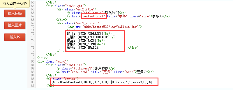 然后把我们刚剪切出来的公用的头部和尾部用我们制作的头部标签和尾部标签来代替,选中头部公用的代码,插入标签—通用全站配置子标签—自定义静态子标签—头部标签,选中尾部公用的代码,插入标签—通用全站配置子标签—自定义静态子标签—尾部标签,插入标签后的代码如下