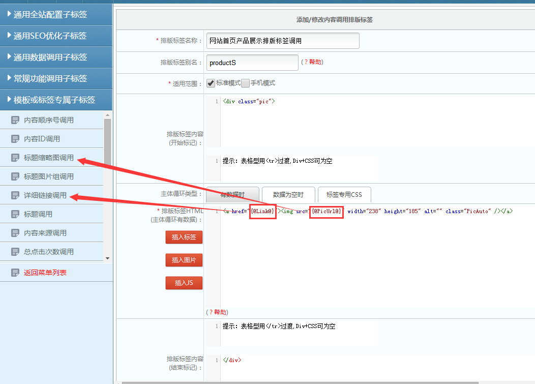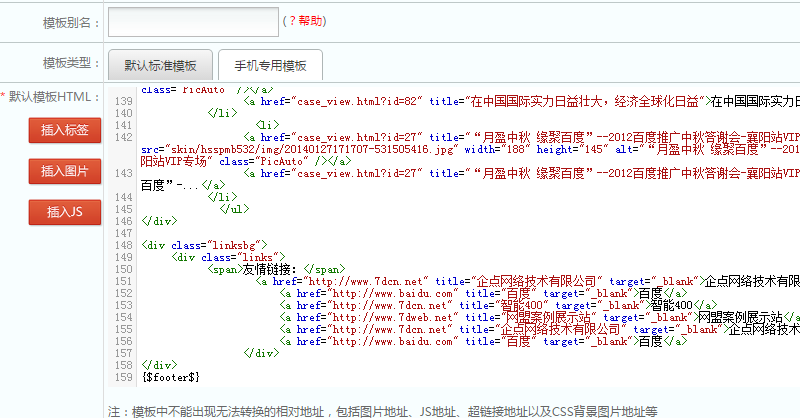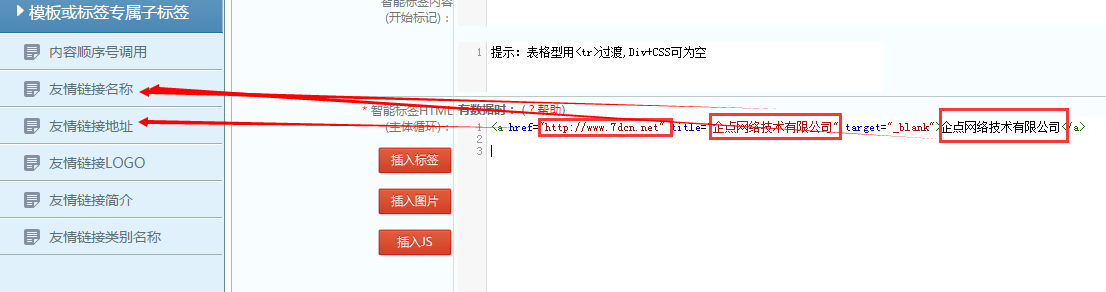 最后是友情链接调用,首先把友情链接循环的部分剪切出来,然后【模版标签管理】——【友情链接排版标签】——【新增智能标签】,然后把各项字段进行标签替换,如下图