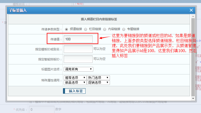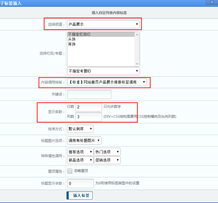 ,链接部分插入标签——营销及常规功能子标签——频道栏目内容链接调用