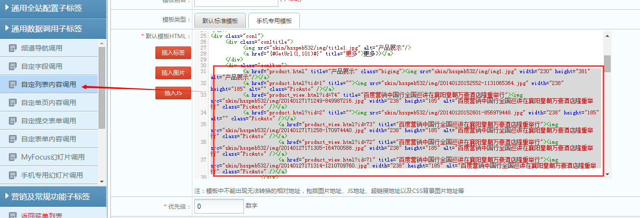 然后回到首页光标停留处,也就是剪切到标签中内容的位置,【插入标签】——【通用数据调用子标签】——【自定义列表内容调用】,参数设置如下:
