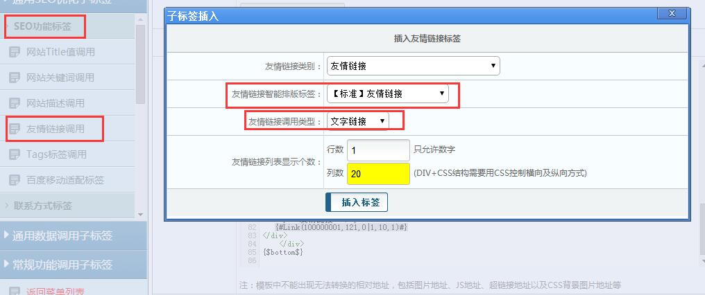 然后回到首页友情链接的位置:【插入标签】——【通用SEO优化子标签】——【友情链接调用】,参数设置如下: