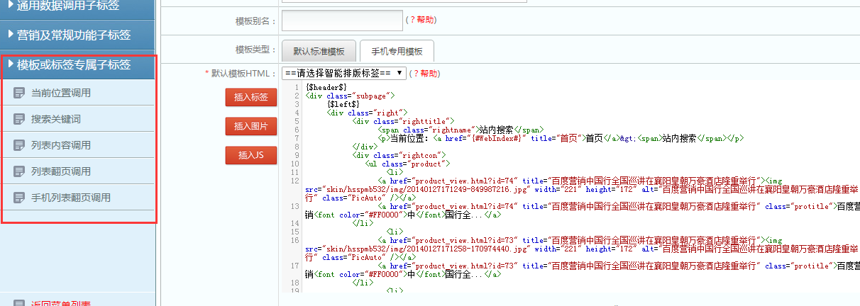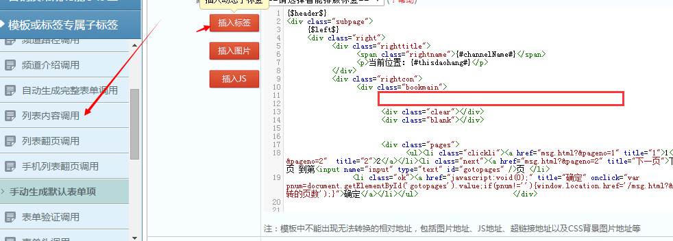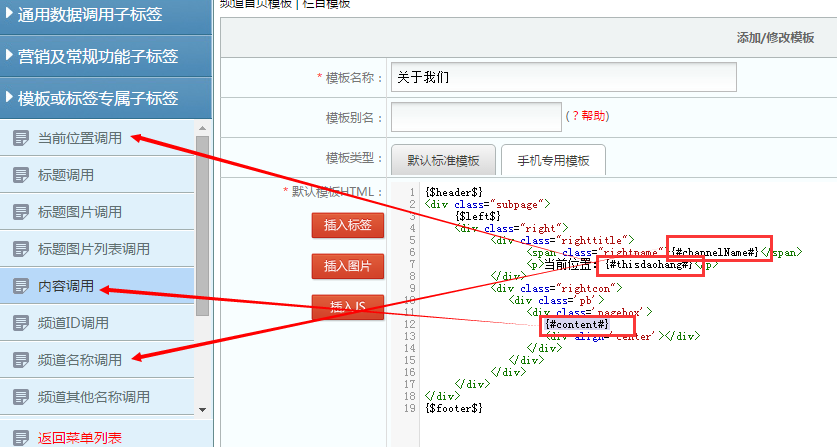 然后插入标签替换头部标签和尾部标签,左侧标签和头部尾部一样的插入方法。我们系统插入标签的方法很容易让人看得懂,如下图所示,频道名称和当前位置,还有内容调用都可以在插入标签——模板或标签专属子标签中直接调用。就这么简单,单页图文型的模板做好了。