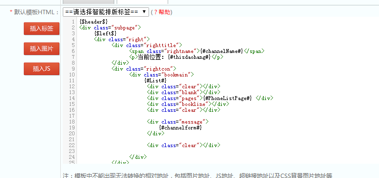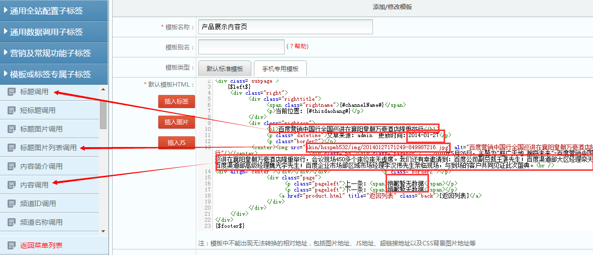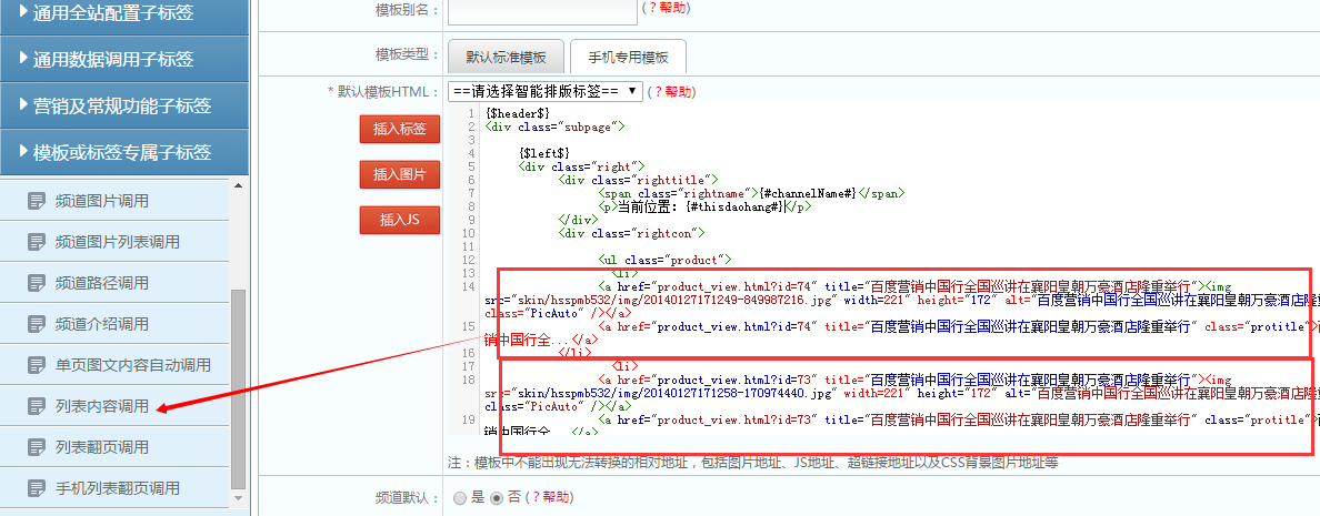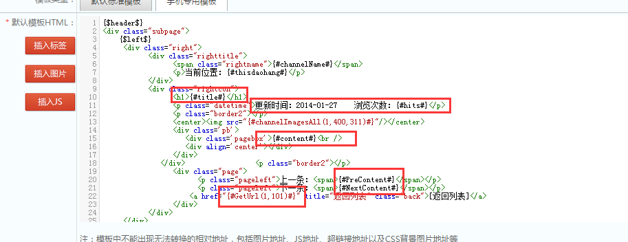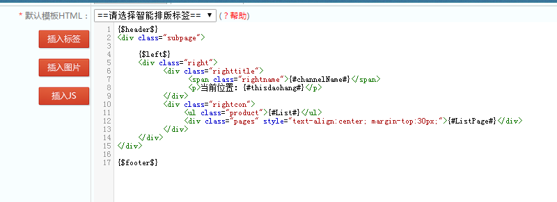 和首页一样,先把文档中所有代码拷贝到对应模板中。模板管理——全站模板管理——频道专属模板管理——频道默认模版————单页图文型型——频道模版——添加新模板