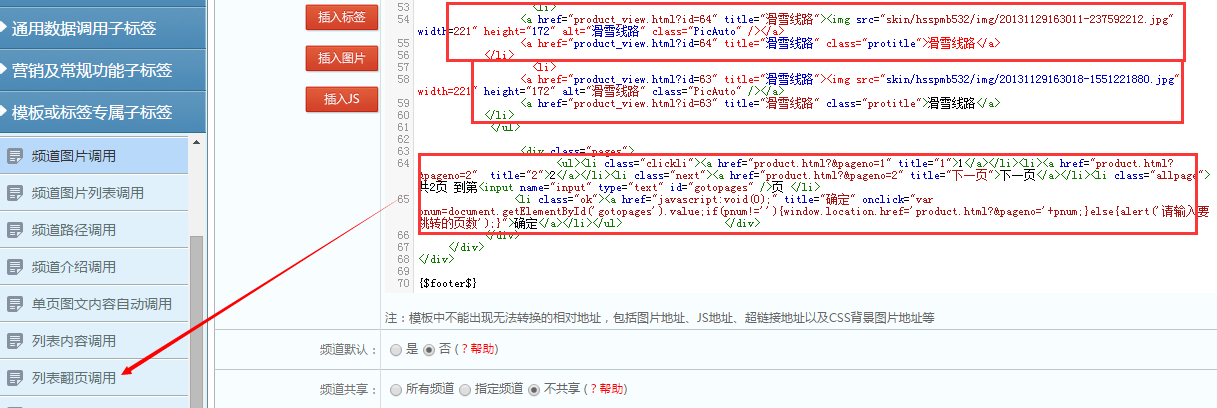 综合列表型频道模板,同样的,把产品展示所有代码拷贝到模板中,然后进行头部标签、尾部标签和左侧栏目标签替换,频道名称和当前位置标签替换。然后把页面主体需要循环的部分用列表内容标签替换,列表翻页替换,如下图所示
