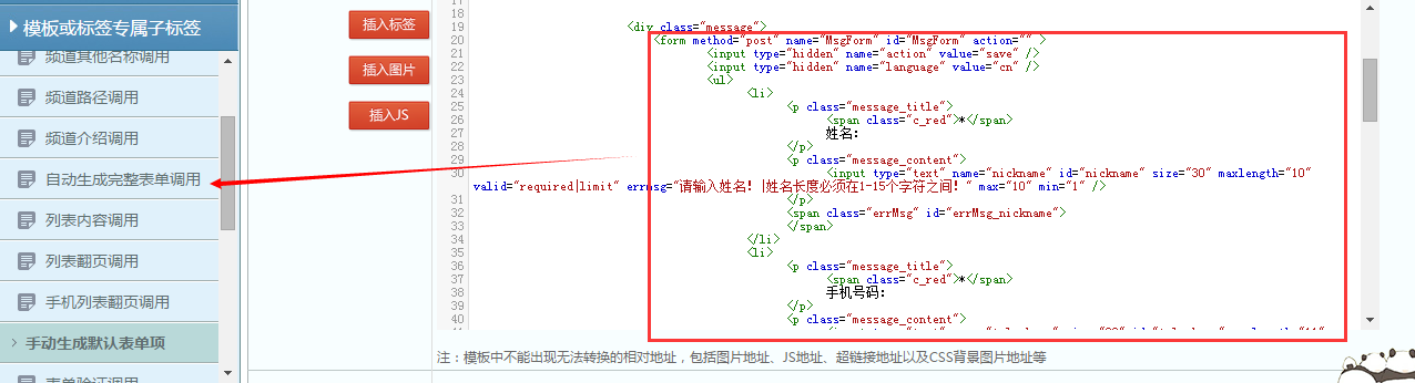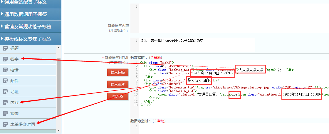 首先,把在线留言频道里的所有代码拷贝到模板管理—全站模板管理—频道专属模板管理—在线留言—表单提交页模板—添加新模板。然后进行头部标签、尾部标签和左侧栏目标签替换,频道名称和当前位置标签替换。