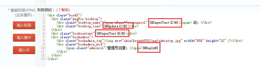 首先我们把循环的这段代码拷贝出来,然后另外开一个窗口,还是在频道专属模板中,在线留言——表单智能排版标签——新增智能标签,然后把刚才拷贝出来的代码粘贴到智能标签的主体循环中,并进行标签替换,如下图所示。