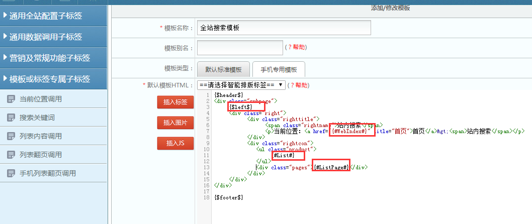 点击【模板管理】【全站模板管理】【常用模板管理】【全站搜索页模板】,可以管理全站搜索页模板。全站搜索页模板和网站首页模板一样,可以把头部,底部等一些通用的内容区块转换成静态标签,并通过【插入标签】【全站配置子标签】插入HTML子标签函数来实现这些内容区域的统一管理。同时,也可以任意插入【全站配置子标签】【全站数据调用子标签】【常规功能及插件子标签】中的相关HTML子标签函数,系统会自动根据子标签的功能调用相应的数据来进行替换显示。与首页模板不同的时,全站搜索页模板有自己的【专属内容调用子标签】,如下图所示: