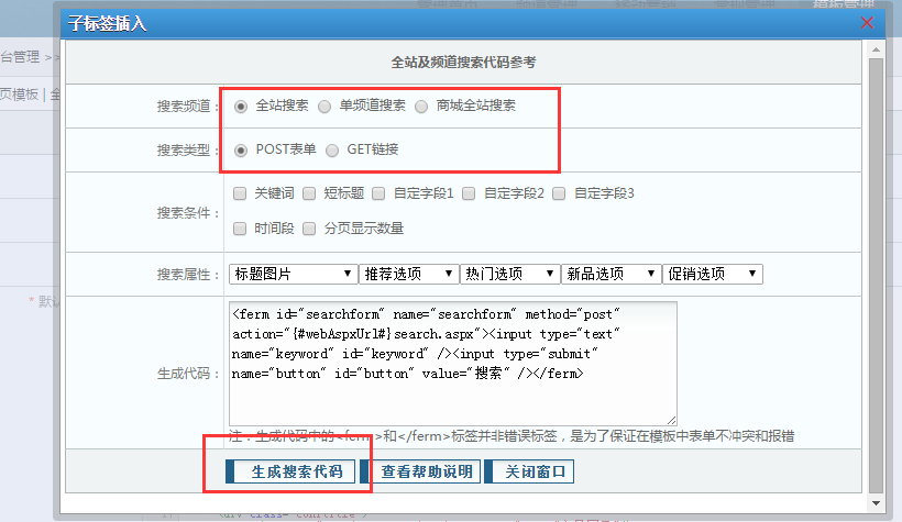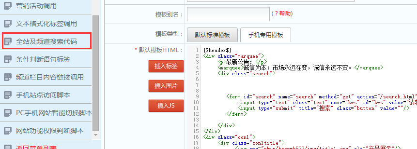 提交保存之后,回到首页搜索部分,插入标签——营销活动及常规功能子标签——全站及频道搜索代码