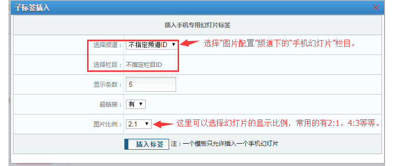 在页面模板中相应的位置,点击【插入标签】→【手机专用幻灯片调用】,弹出如下图所示对话框: