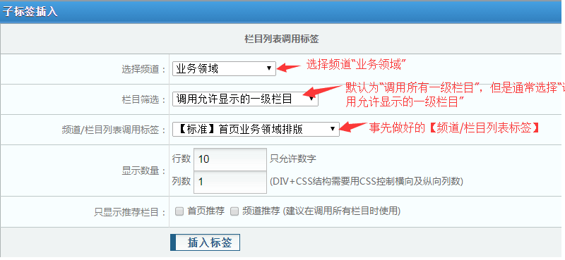 如图所示的例子,在网站的首页要显示“业务领域”频道下的栏目列表,这是就要用到【一级栏目列表调用】标签,该标签的对话框如下: