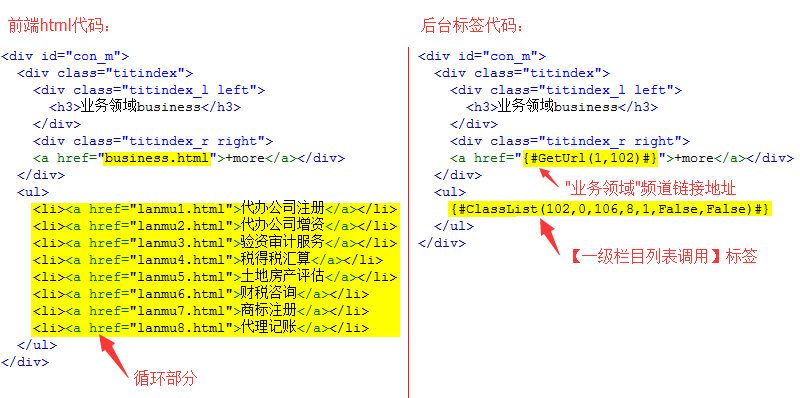为了跟清晰明白的理解【一级栏目列表调用】的作用,下面详细对比了前端html代码和后台标签代码的区别:
