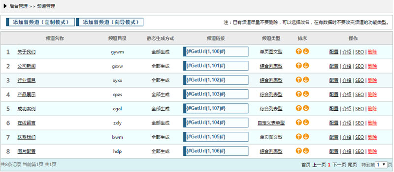 在这个频道列表,我们可以看到,关于我们、联系我们是单页图文型的,公司新闻、行业信息、产品展示、成功案例、图片配置是综合列表型的,在线留言是自定义表单型的。其中综合列表型和自定义表单型的,除了操作一列中,有相关的操作按钮以外,在频道类型这一列中,也可以通过超链接点进去,进行一些其它的相关配置。