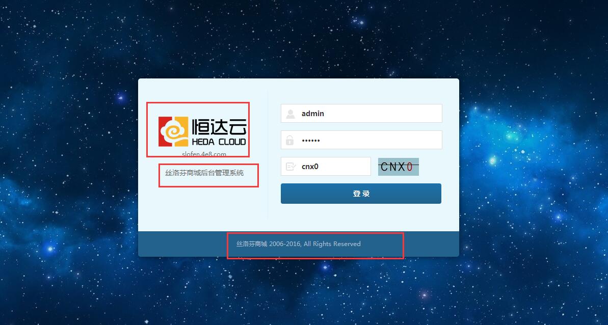 改完之后,在终端客户登录后台或者是进入到终端客户网站时,这里的登录界面就会显示代理商在这里新设置的名称、logo、背景图片以及版权信息