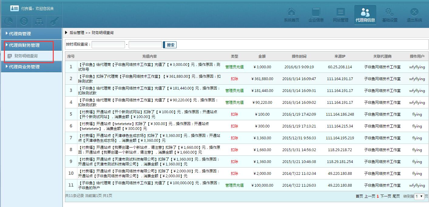 【代理商财务管理】,可看到充值、开站、退费等一些财务明细,包括内容、时间、余额、操作用户等。