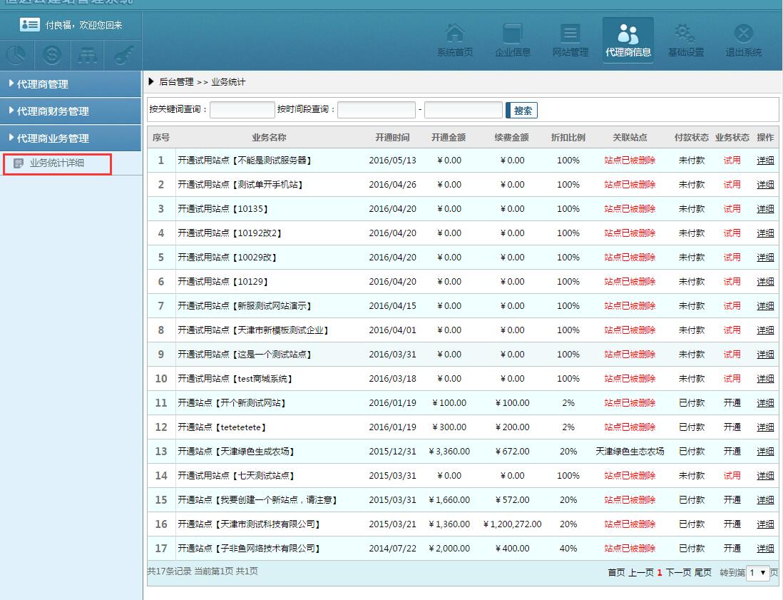 【代理商业务管理】,可看到开站、续费、暂停、删除等对网站的一些操作,也可查看作此操作的员工、时间和费用情况。