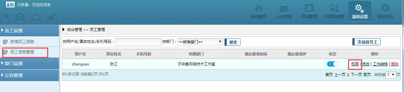 【员工信息管理】,这里可以查看添加的员工信息,然后可以点击操作选项中的权限,根据业务需要为该员工分配权限