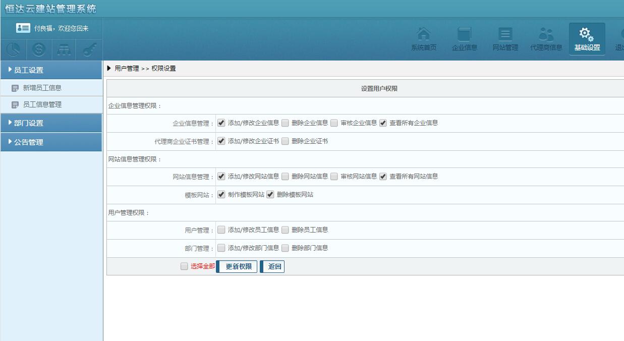 代理商登录到平台之后,点击导航上方的【基础设置】,可看到左侧有:【员工设置】、【部门设置】、【公告管理】
