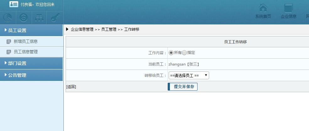 或者是进行工作转移操作,及把当前操作员工的工作转移到其他员工帐号下。