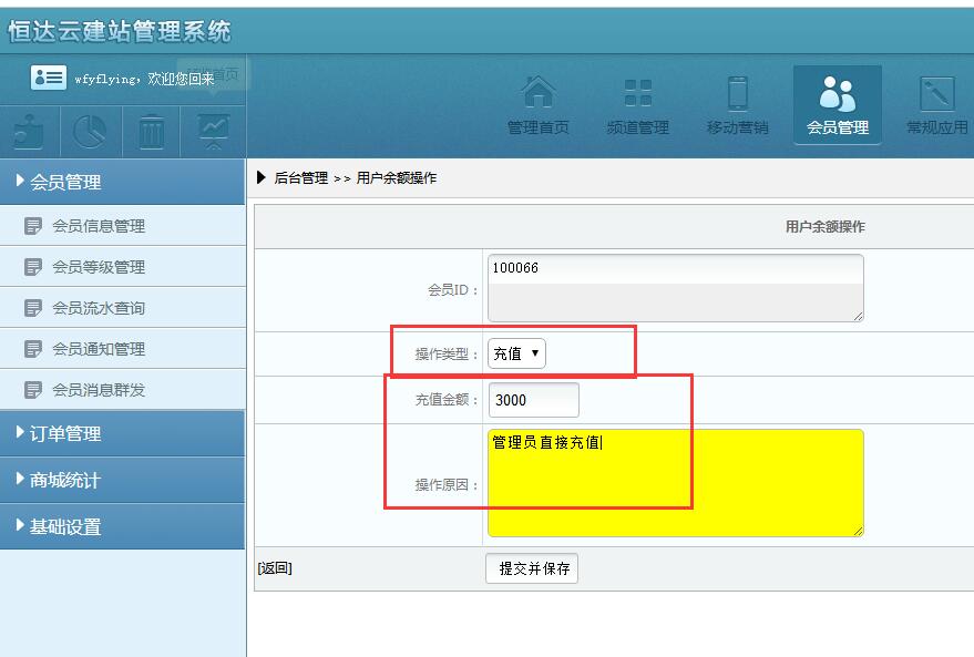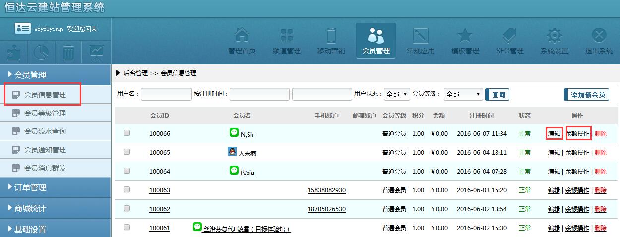 [会员信息管理]:可查看会员注册时所用的手机号、邮箱或会员名,会员等级和余额积分情况
